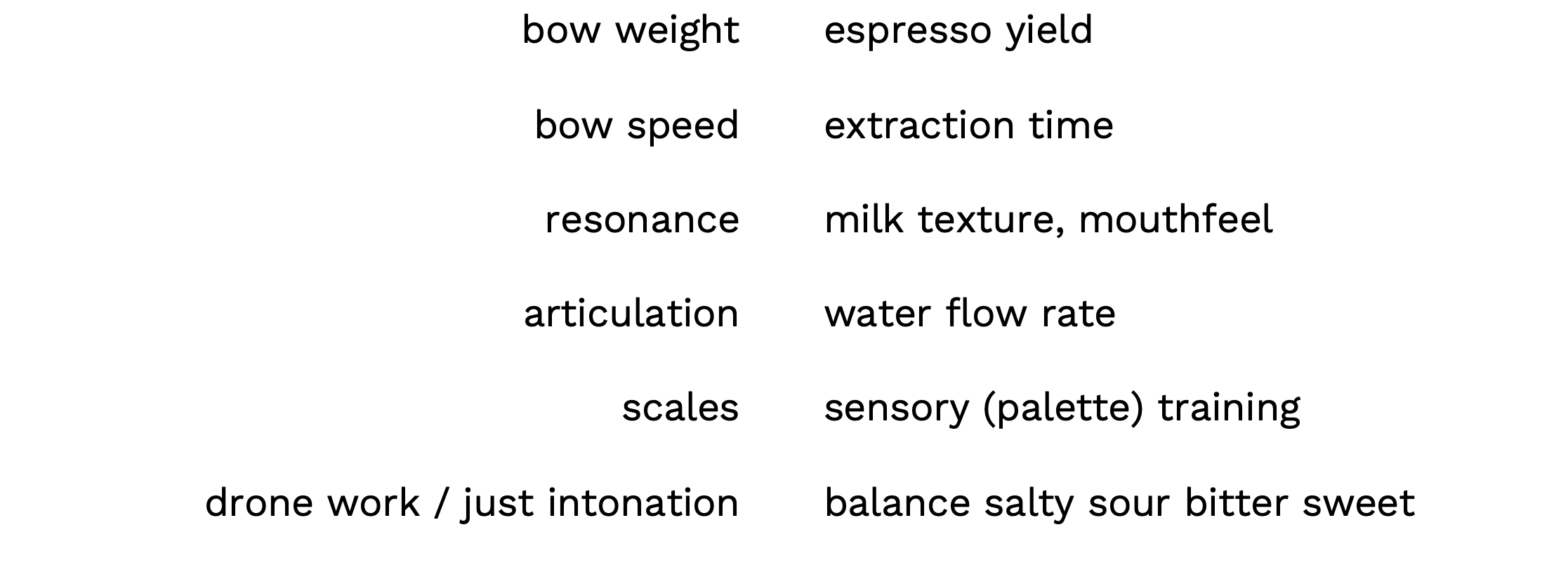 I'm compliant: I can play any articulation you'd like, and brew the most delicate tropical fruit coffee or food-safe paint-stripper. Instead of worrying about which career or what direction I “should” go in, I focus on what I can improve on in both fields: clarity, conveying sensations, and guiding people through what their experiences can be.